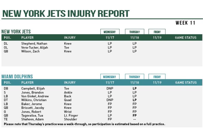 There's actually no change here for the Jets, who will hope Vera-Tucker can play but might give a debut to Laurent Duvernay-Tardif if he can't.