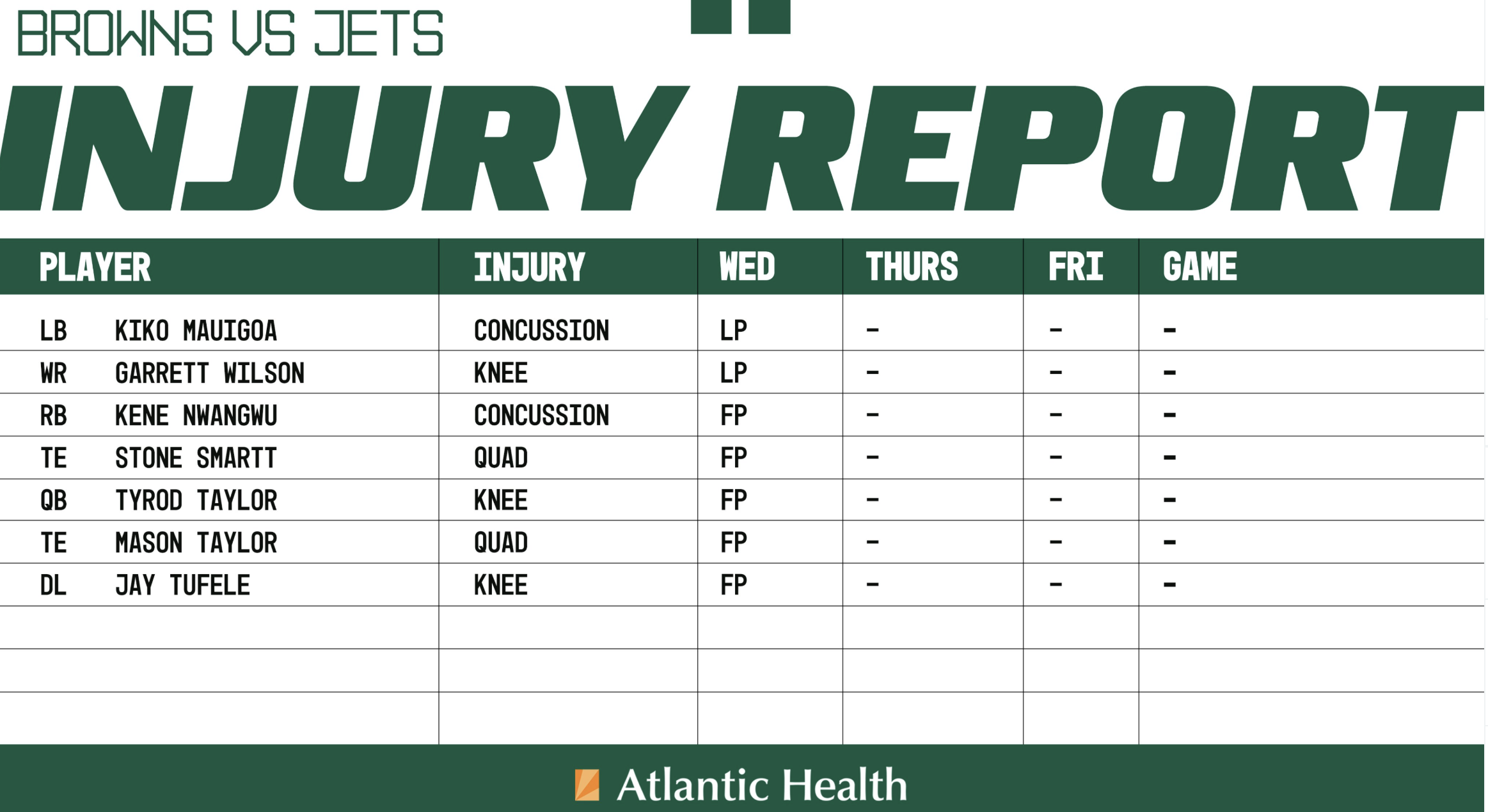 Those that remain are pretty healthy coming off the bye, although Andre Cisco did head to IR today. We shall see what else develops.