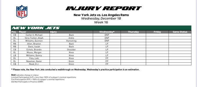 Finally, at running back, Breece Hall is off the injury report but his two backups were both limited due to back issues.