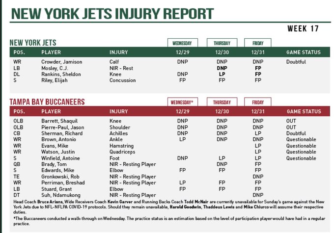 While Crowder is listed as doubtful, that generally means "out" although Robert Saleh expressed that he has a less than 50 percent chance of playing. Frustratingly, Saleh also confirmed that Elijah Moore is not ready to play this weekend so the Jets will have to work with the same group of receivers as last week. Moore could still play against the Bills in the season finale.
