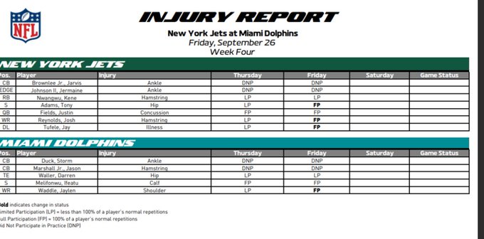 On Miami's side, offensive line is obviously an issue with so many players already on injured reserve but that's not getting any worse for them this week. Having two cornerbacks who would be or have been in the rotation out would be significant though, because that's already a weakened group after they traded Jalen Ramsey and then lost Artie Burns and Kader Kohou to ACL tears in camp.