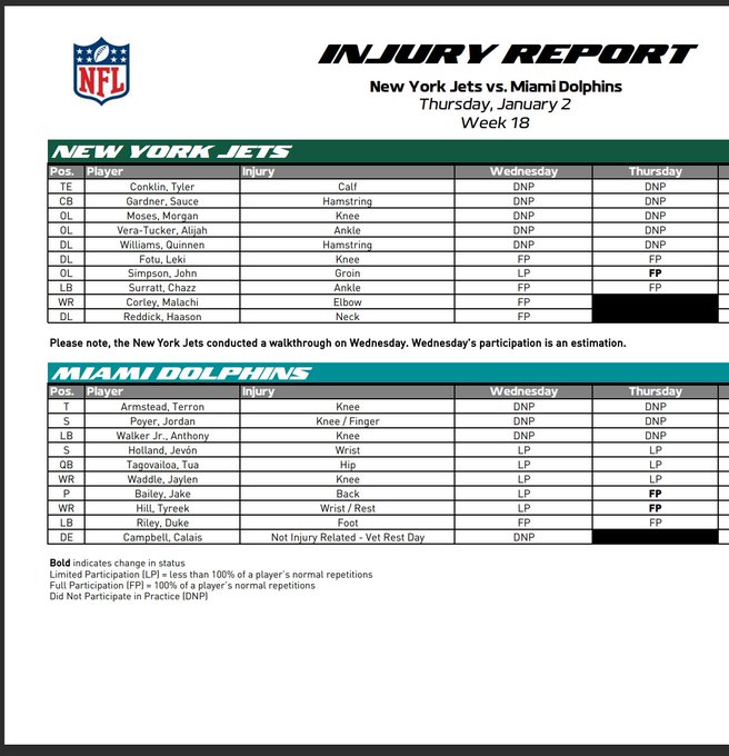 With the only change being John Simpson's return to full practice, things are looking good for the five players who didn't participate yet. However, there have been plenty of Jets veterans who missed practice time but still played in recent weeks because we're basically at the stage where there's little to be gained for these guys. They should know what they're doing by now. We will see what tomorrow's report looks like.