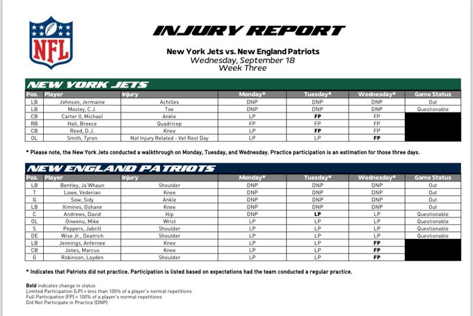 Andrews would be a huge loss because he played every snap last year, so it seems inevitable he will play along with Onwenu. Nick Leverett is their backup center. Wise and Peppers being out would also hurt New England's depth from an experience perspective but again it seems likely both will play.