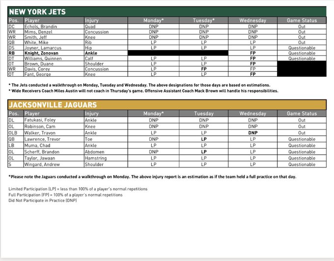 It's looking promising for Williams with a full practice designation and the Jets will hope to have Joyner and Knight back.