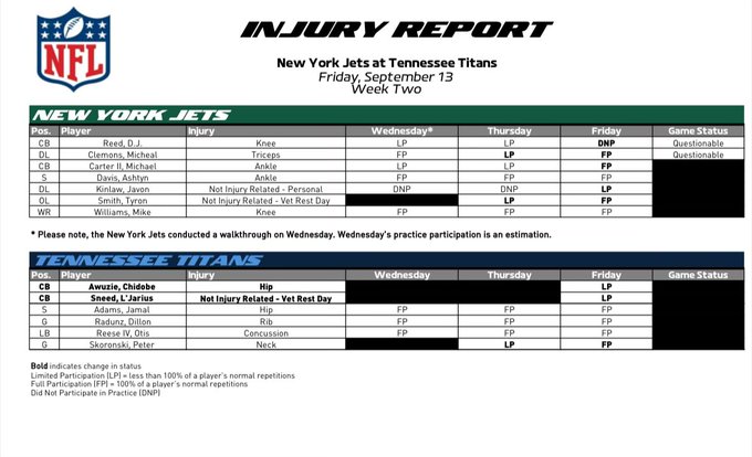 Robert Saleh seemed confident everyone would be available on Sunday but we'll have to see whether he's just keeping his cards close to his chest with regard to Reed, who was assessed ahead of practice and did not participate.