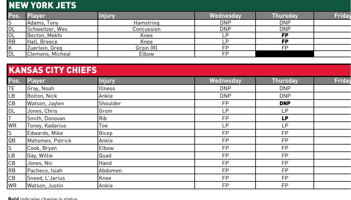 While there was no real change to the Jets' injury status, a couple of Chiefs players were downgraded. There will be concern over Smith and Bolton, who are starters. Gray and Watson are both reserves but they did play 76 snaps between them last week.