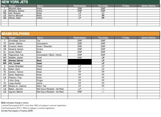 Miami remains banged up but at least got Waddle Ingram back at practice today. Howard and Armstrong are their primary concerns, although Hill getting added to the report is also worth watching.