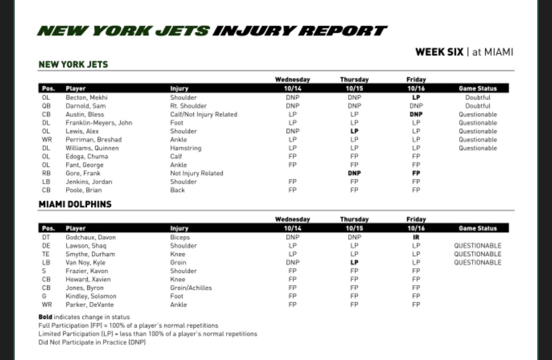 Clearly Becton and Darnold won't play but are perhaps trending towards a return next week. The Jets will hope to have Perriman back though.
