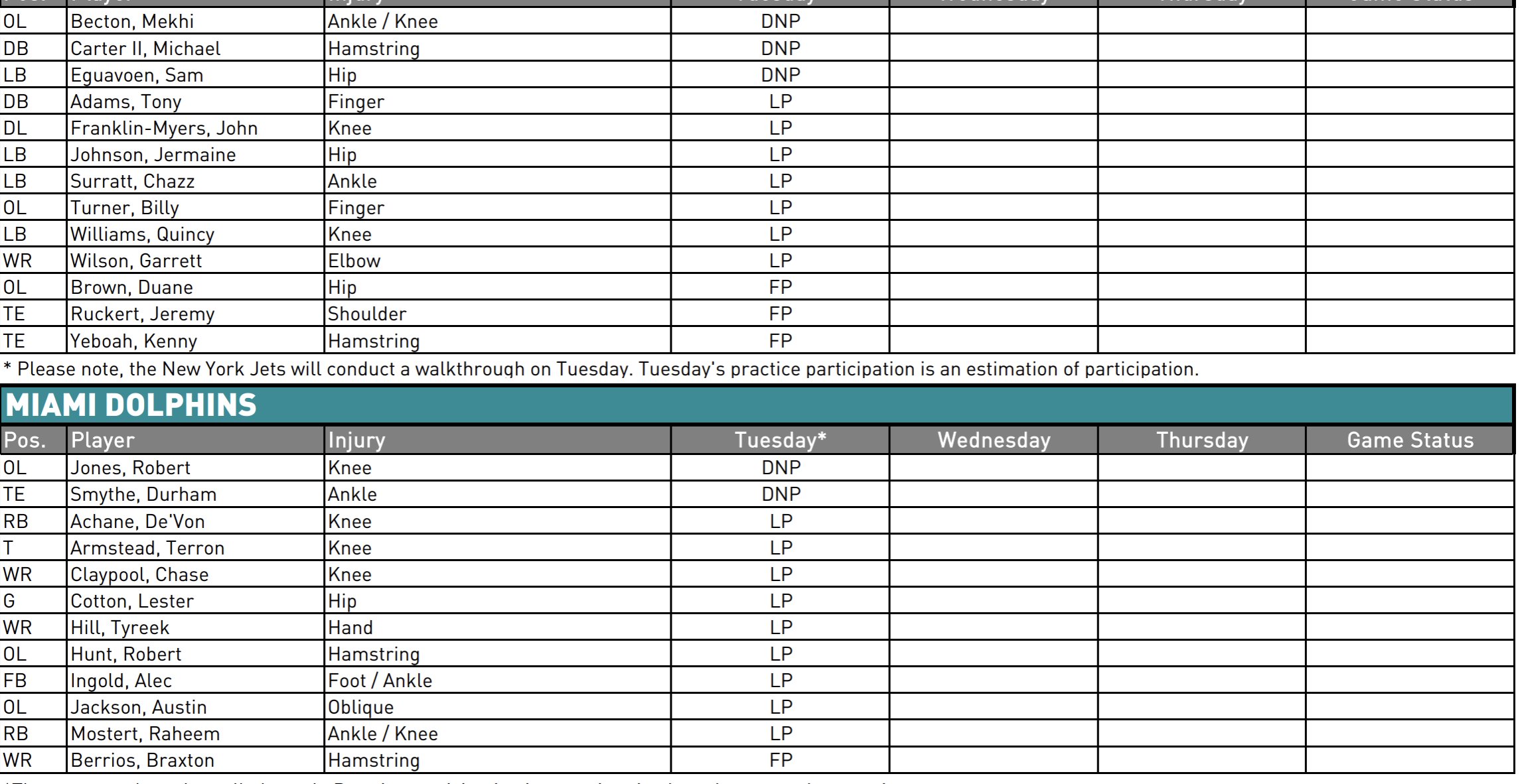 Newman, Turner and Carter are apparently making progress but their status is yet to be determined. Carter may practice tomorrow according to Robert Saleh.