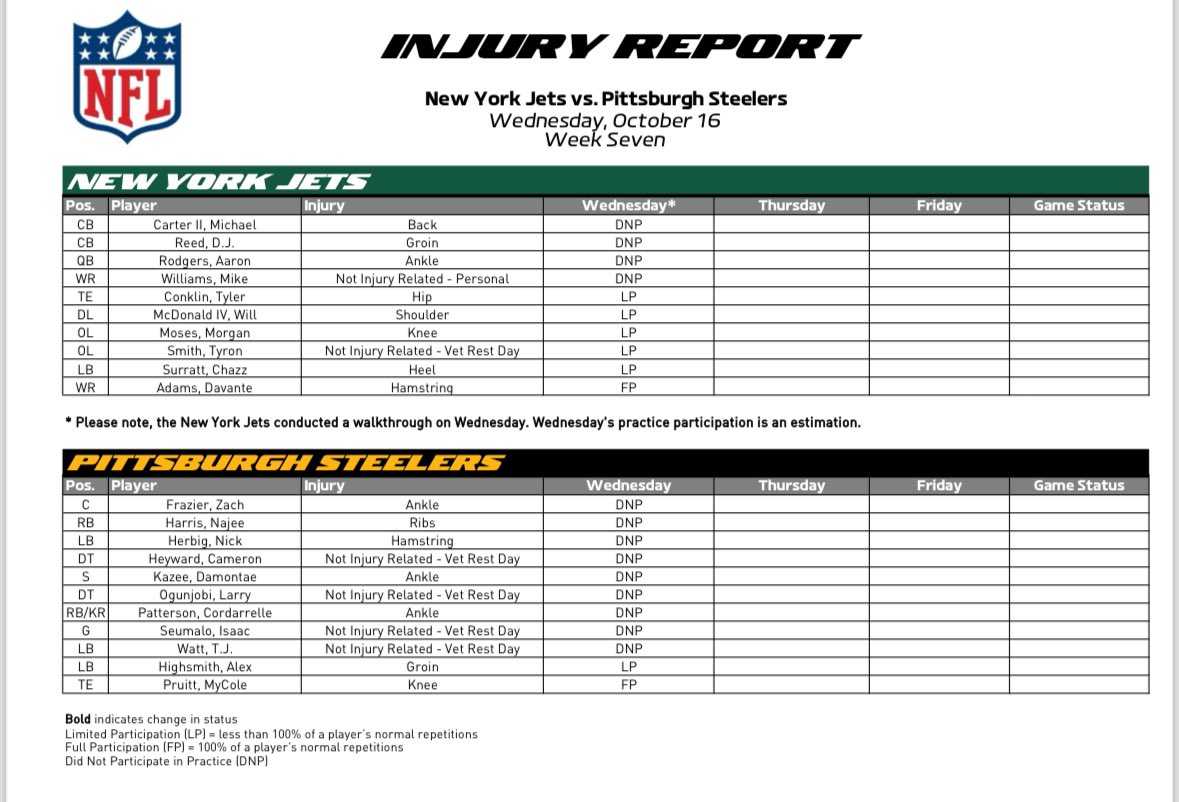 The first injury report of Steelers week has been released: