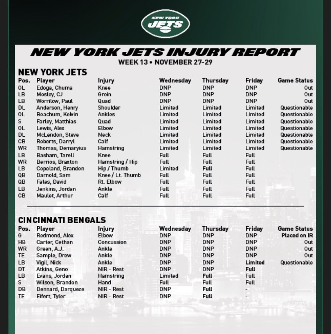 The Jets issued their official injury report ahead of Sunday's game: