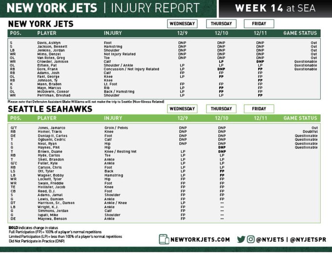 Seattle's full injury report will be out later but they had seven players who did not practice and another four who were limited yesterday. However, Carlos Dunlap remains the only starter not practicing due to injury. As you can see, he's listed as questionable for now, with only one player ruled out and one doubtful.