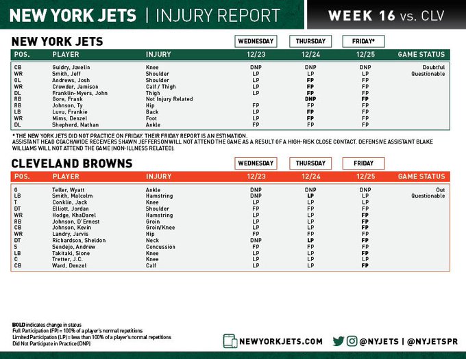 For the Browns, Teller was always going to be out for this week. Rookie Nick Harris started in his place last week in the win over the Giants. The Browns hope to have Teller back for the playoffs.