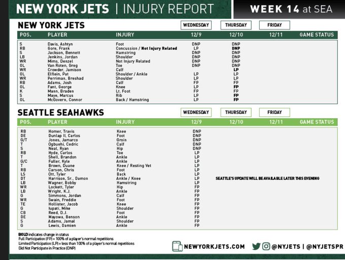 The Jets have released Thursday's injury report: