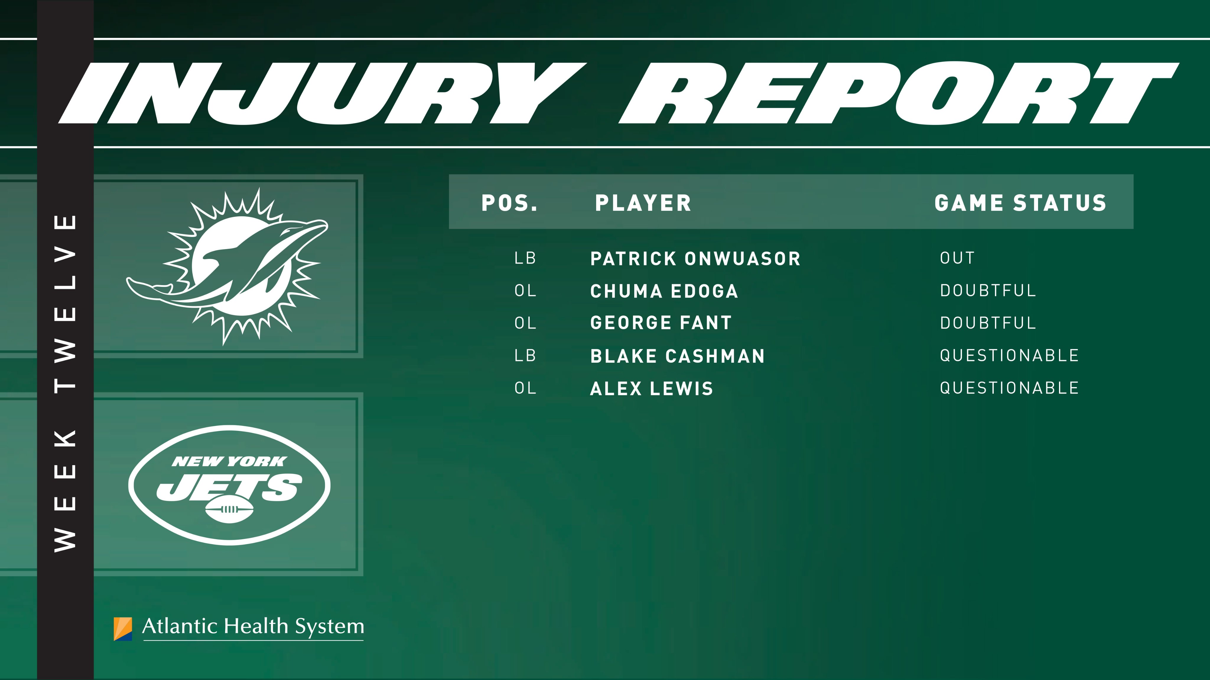 The Dolphins named right guard Solomon Kindley and running back Salvon Ahmed as out with Jakeem Grant and Tua Tagovailoa listed as questionable. They may add Myles Gaskin back to the active roster as he's been practicing off injured reserve.