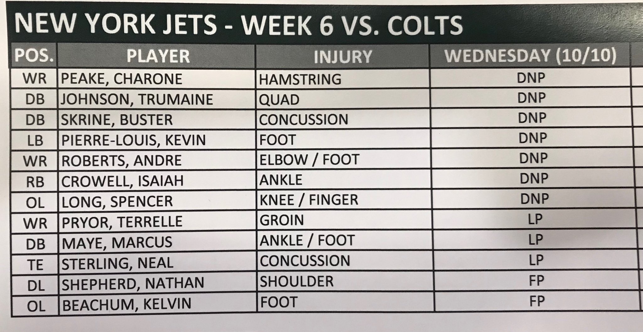 According to Todd Bowles, Peake will not play, but the others still have a chance. Crowell apparently suffered an ankle injury during his record-breaking performance on Sunday.